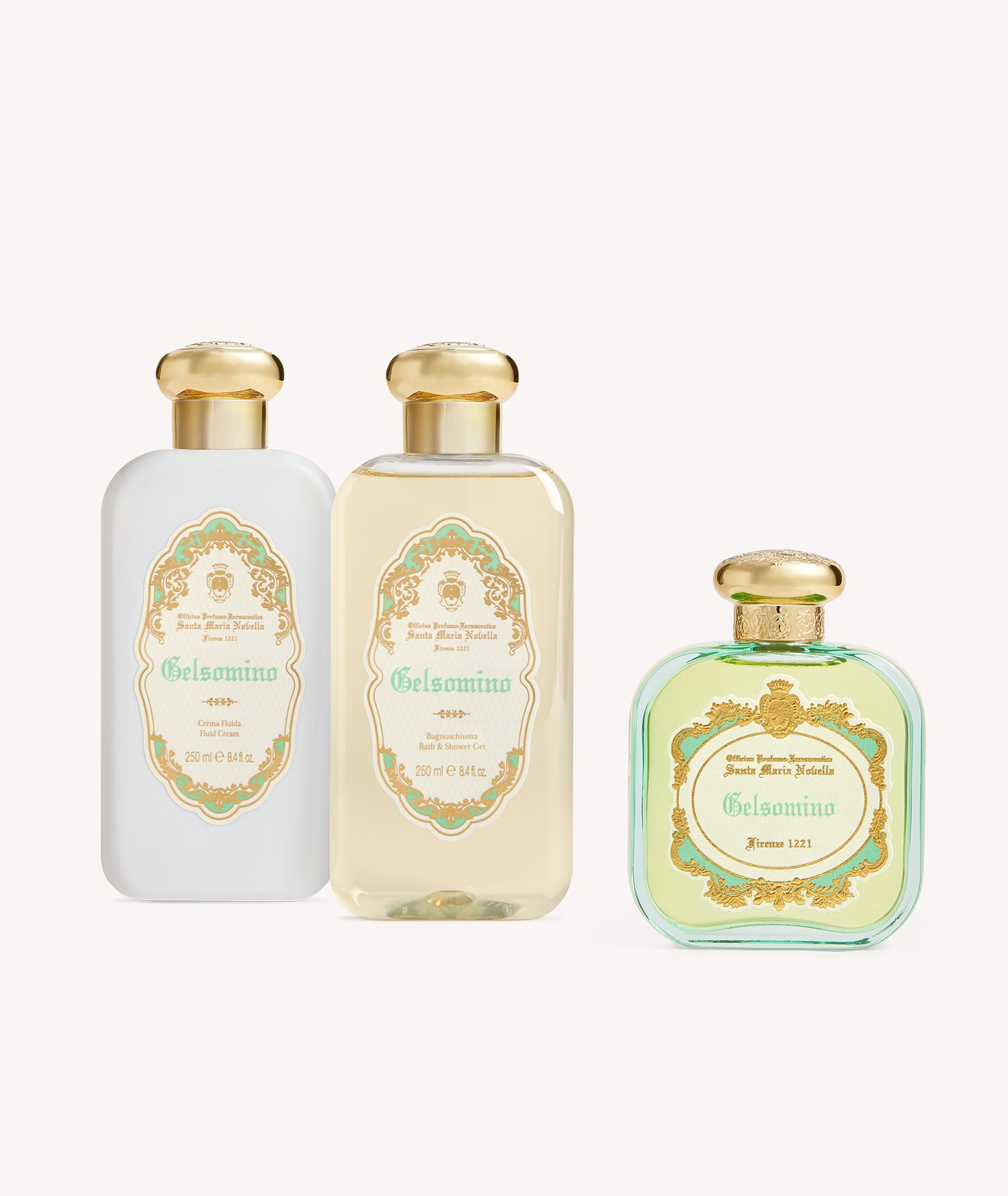 The boldness of Gelsomino Eau de Parfum lives on today in this precious body cream, crafted with vegetable oils and butters to caress the skin and give it a velvety softness. Let yourself be enveloped by the gentle touch of Gelsomino Fluid Body Cream and its unique essence.