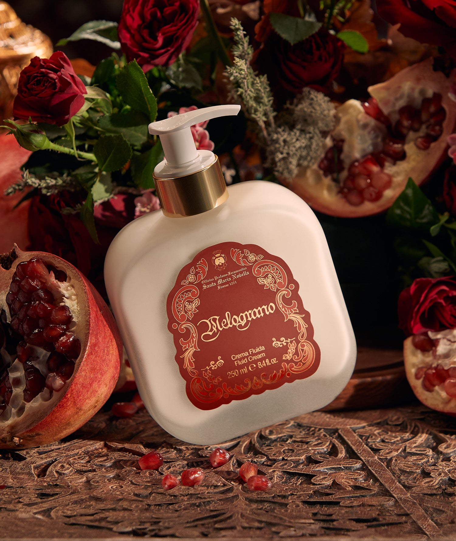 From the magical allure of distant lands comes one of the most recognizable essences of Officina Profumo-Farmaceutica di Santa Maria Novella: Melograno. The Fluid Body Cream is formulated with a blend of vegetable oils and butters, leaving the skin as soft as silk.