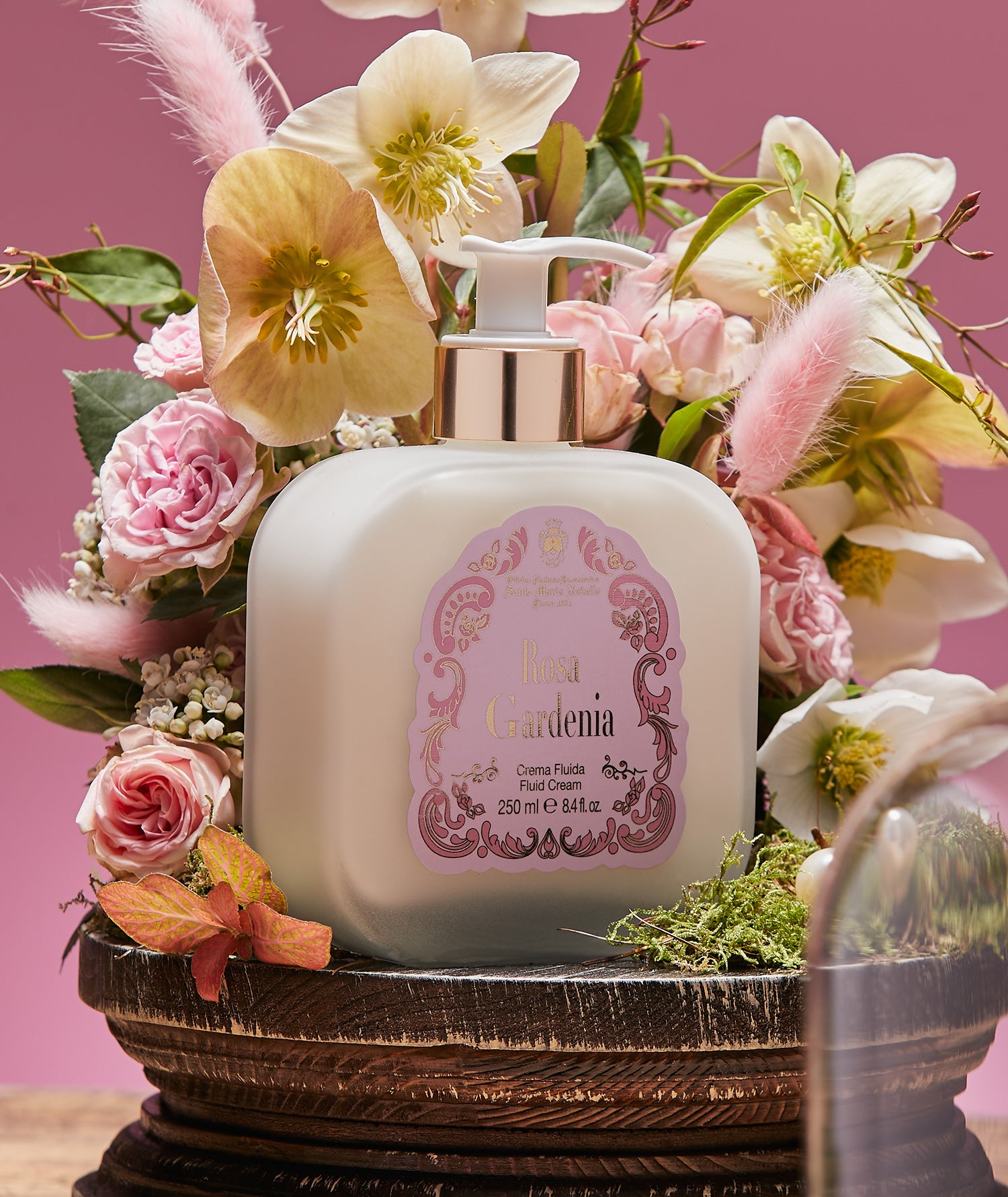 Cherish your skin with the gentle caress of Rosa Gardenia Fluid Body Cream, enriched with plant-based oils and butters. Its enveloping fragrance evokes the olfactory universe of the Eau de Cologne of the same name.