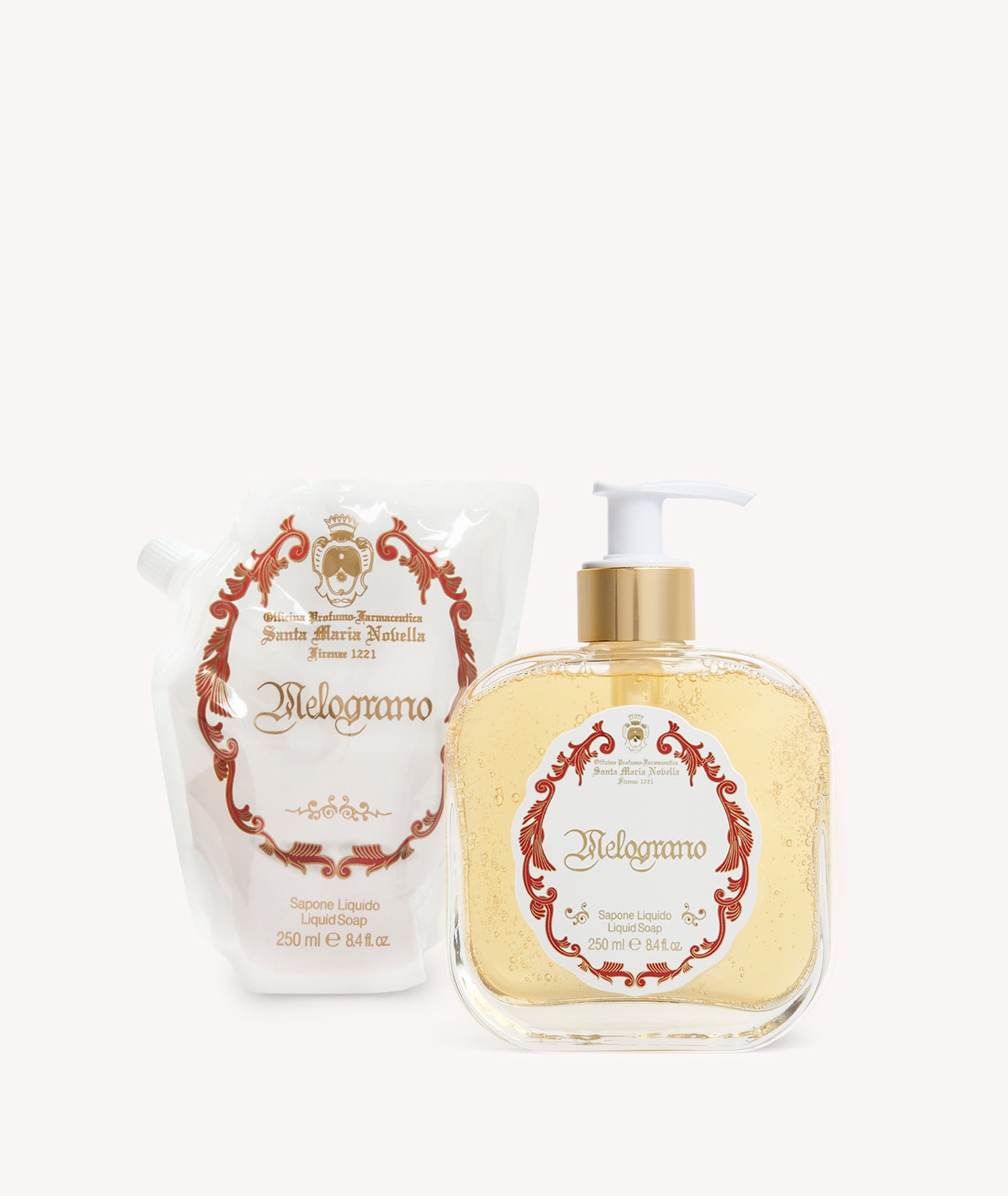 The Melograno Liquid Soap by Santa Maria Novella captures the distinctive essence of pomegranate, combined with a gentle and natural formula that ensures effective and respectful cleansing of your skin.